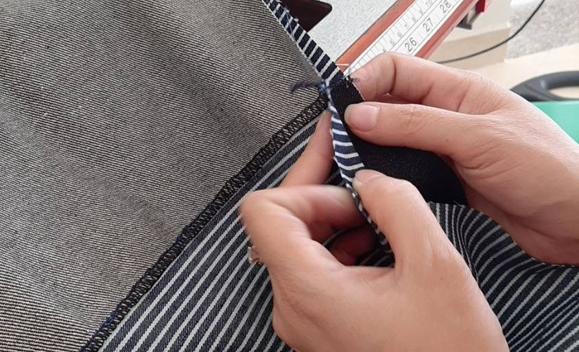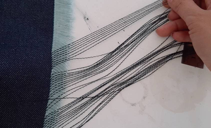 ヒッコリー柄&インディゴ色パッチワークカーテン作業風景